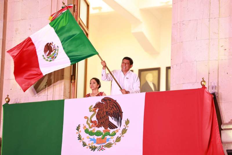 “Oaxaqueñas y oaxaqueños… ¡Vivan los héroes que nos dieron patria y libertad!, ¡Viva Hidalgo!, ¡Viva Morelos!, ¡Viva Josefa Ortiz de Domínguez!, ¡Viva Allende!, ¡Viva Aldama!, ¡Viva la Cuarta Transformación!, ¡Viva el Segundo Piso de la Cuarta Transformación!, ¡Viva la Presidenta Claudia Sheinbaum!, ¡Vivan nuestras hermanas y hermanos migrantes!, ¡Viva la Primavera Oaxaqueña!, ¡Viva Oaxaca!, ¡Viva la Independencia Nacional!, ¡Viva México!, fue la arenga que el Gobernante exclamó.