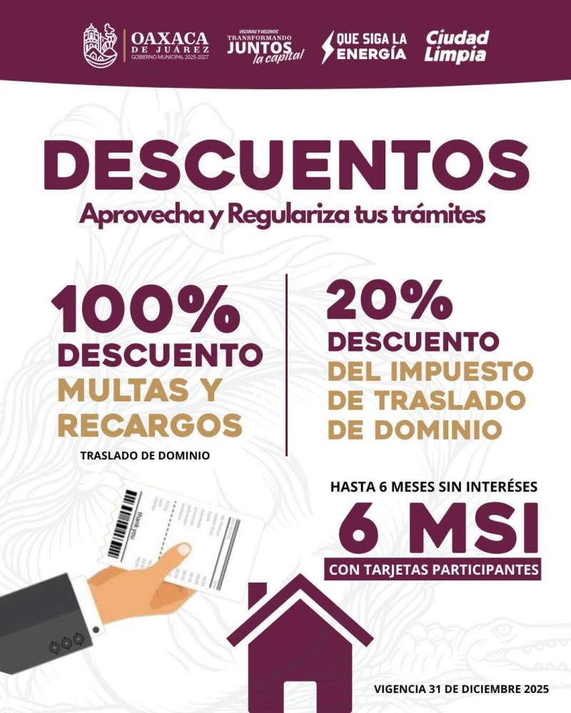 Oaxaca de Juárez, Oax., 10 de octubre de 2025.–Con el propósito de fomentar la regularización de trámites y brindar facilidades a la ciudadanía, el Honorable Cabildo de Oaxaca de Juárez aprobó el estímulo fiscal denominado “No te quedes atrás, regularízate”, mediante el cual se otorgan descuentos del 20% en la suerte principal y del 100% en los accesorios del impuesto sobre la traslación de dominio a personas físicas, morales o unidades económicas que se pongan al corriente.